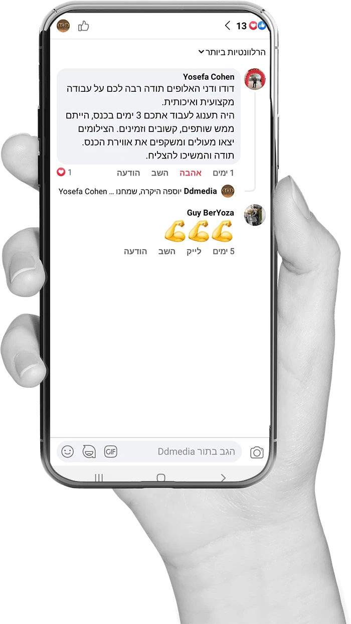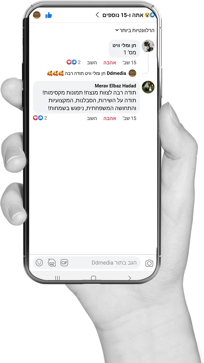 אנחנו לא רק מצלמים אירועים – אנחנו מייצרים נכסים דיגיטליים וזיכרונות שנשארים לתמיד. הצטרפו למאות הלקוחות שכבר בחרו להיראות במיטבם עם DD-ARTMEDIA.